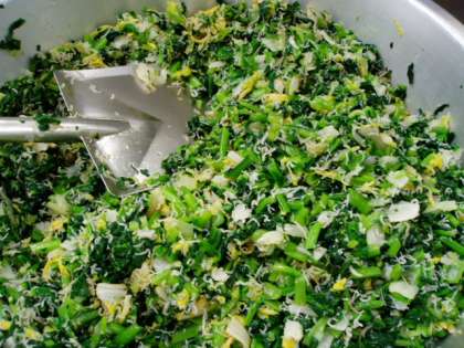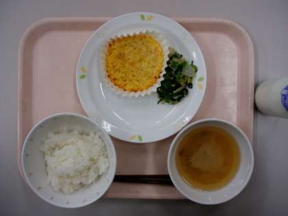 にんじんやたけのこのみじん切りが入っている、具だくさんですが食べやすいたまご焼きが焼きあがりました。今日は小松菜とはくさいのおひたしにじゃこを混ぜた、じゃこあえです。じゃこのうまみと歯ごたえで、おいしく野菜が食べられて、カルシウムもしっかりとることができます。