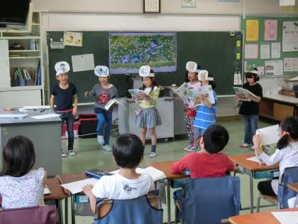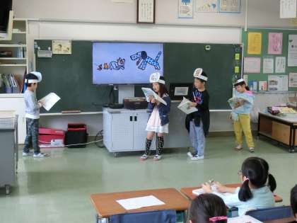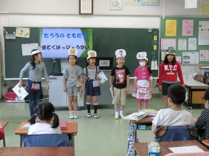 発表では、大型ディスプレーに映した物語の挿絵をバックに、それぞれの役割のお面をつけて一生懸命に音読することができました。「緊張したけど、楽しかった。」と、やり遂げた達成感を味わうことができました。