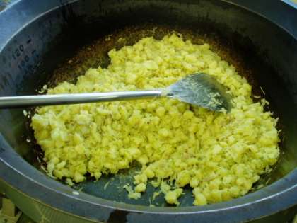 本日の魚は今が旬のさわら(鰆)です。さわらは青魚の仲間ですが、臭みが少なく食べやすい魚です。オーブンで1回200枚のさわらを焼いています。ホクホクの食感がおいしいジャーマンポテトもできあがりました。