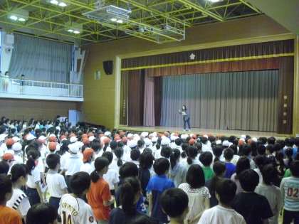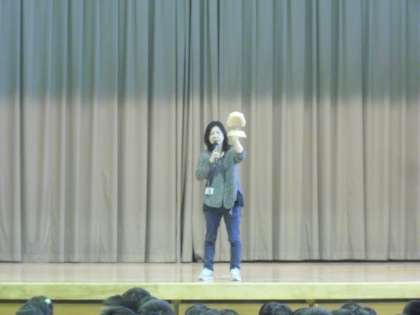 音楽の岩下先生からは校歌の歌い方について、口の開け方や歌い出しを中心に教えてもらいました。最後に、学んだことを生かして全校で元気に歌いました。