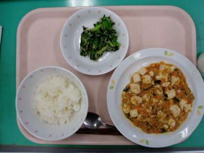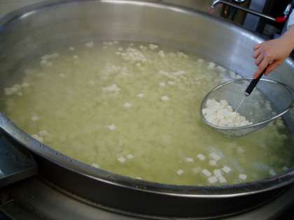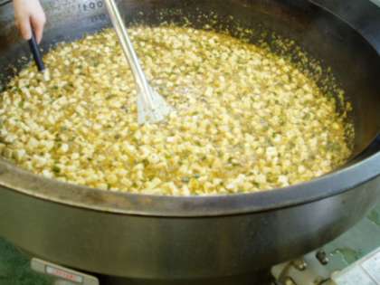 麻婆豆腐の豆腐の下ゆでと、たけのこやにんじんなどが入った具だくさんの中華あんをそれぞれ別の釜でつくっています。豆腐はをしっかり加熱されているか中心温度を確認した後で、中華あんと混ぜて人気献立の麻婆豆腐ができあがります。