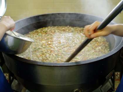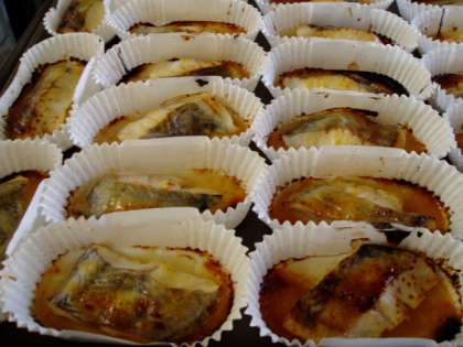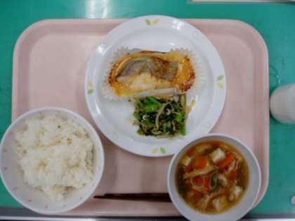 本日の汁ものは吉野汁です。けんちん汁に似てますが、とろみをついています。以前は葛粉つけてとろみをつけていたことから、葛粉の名産地、奈良県吉野からこの名前がつきました。人気がある魚のみそマヨネーズ焼きも焼きあがりました。