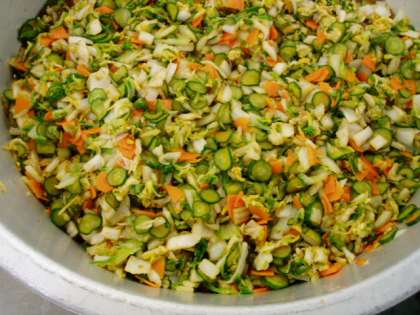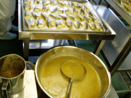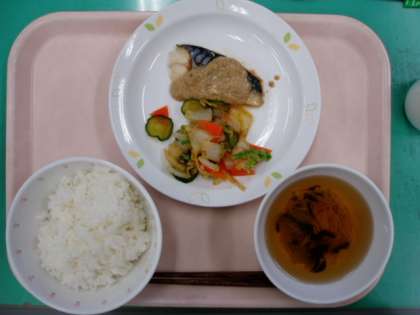 練りごま・すりごま・いりごまがたっぷり入ったみそ味のごまだれができました。パリっと焼いたさばに、たっぷりとかけていただきます。白菜のおかかかけも完成です。給食室でけずりぶしをから炒りしているので風味がよく、野菜をおいしく食べられます。
