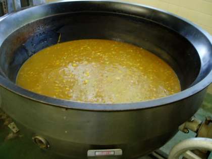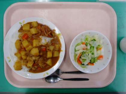 本日は人気献立のポークカレーライスです。昨日から楽しみにしていたという声も聞こえてきました。カレールーだけではなく、とりガラスープも給食室手作りのカレーはじっくり釜で煮こんでいるので、とてもコクがあります。