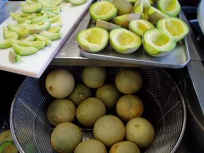 紙カップにじゃがいもが入った具と卵液を流し入れ、オーブンで焼きスペイン風オムレツのできあがりです。トマトソースをかけていただきます。本日のくだものは旬のメロンです。給食室で丁寧に種をとり、切り分けています。