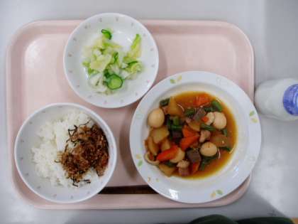6月4日から10日は、歯と口の衛生週間です。給食では噛むことの大切さを確認できるように、1品特によく噛んで食べる献立にしました。本日はかみかみ佃煮、けずりすし・こんぶ・ちりめんじゃこ・ごまを甘辛く煮た、ごはんに合う1品です。じっくり煮込んだ豚肉と大根のうま煮もできあがりました。