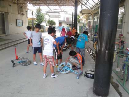 運動委員会は、一輪車やボールの空気入れをやっていました。