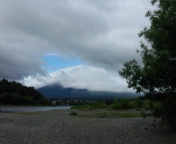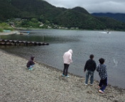 河口湖湖畔に行きました。子どもたちは、早速、石を投げて遊びました。富士山の裾野は見えますが、頂上は雲の中です。