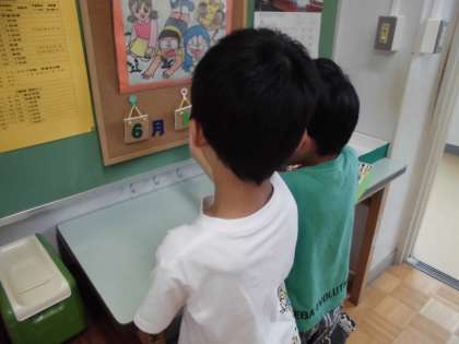 5・6年生が河口湖に行っている間、1・2・3年生は留守番をしています。学級の手紙運び、出欠席の保健板運び、野菜の水遣り、カレンダーの日付変えなどいつも高学年の人たちの仕事をみんなで分担してやっています。お兄さん、お姉さんたちが河口湖で頑張っている分、留守番隊もしっかり係りの仕事をしています。「明日は、みんな帰ってきてくれるね。」と5・6年生の帰りを楽しみに待っています。土曜日には、「おかえりなさい、ただいまの会。」を開いて、お互いの頑張りを発表し合う予定です。