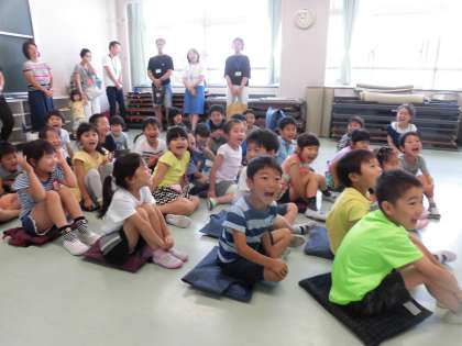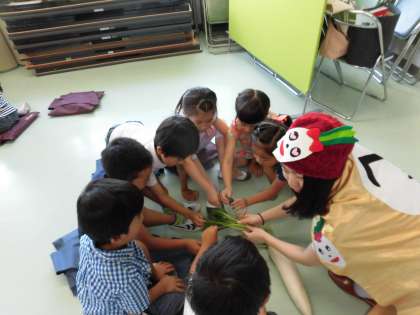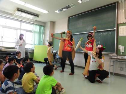 東京農業大学の方々に、紙芝居やクイズで野菜について教えていただきました。途中、紙芝居に出てきたベジレンジャーが登場して、みんなびっくりした様子でした。ベジレンジャーと一緒に、野菜の仲間分けゲームをして楽しみ、「野菜、食べるぞ!」と宣言し、最後は握手でお別れしました。