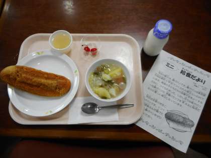 メニューは、大人気のきなこ揚げパンとポトフ、梅ゼリーでした。さらに、ランチルームのおまけデザートの『サクランボ』もあり、梅とサクランボで季節を感じる食事になりました。