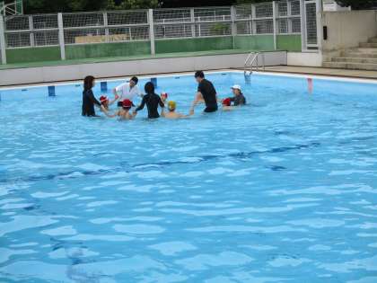2時間目は、いよいよ、第1回目の水泳です。シャワーを浴び、水泳キャップをかぶり、ゴーグルも着けて、準備万端です。笛の合図をよく聞いて、水の中に入りました。水の中を歩いたり、跳びはねたり、体をたくさん動かして水と仲よくなりました。