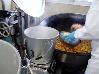 肉じゃがうま煮をつくっています。最後にえだ豆を入れて、できあがりです。できたての肉じゃがはとても熱いのですがボールなどをつかい、衛生に気をつけて汚さないように各学級に配缶作業をしています。