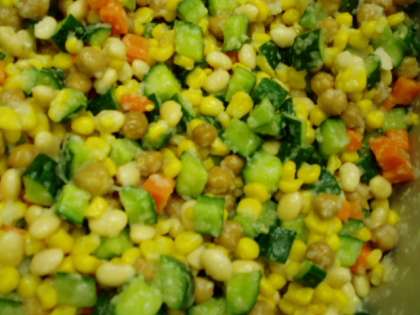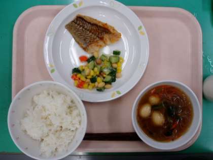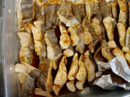 オーブンでしっかりとホキを焼き上げた後に、手作りバーベキューソースをかけています。しょうゆベースの甘辛いソースです。ビーンズサラダもできあがりました。大豆に比べて少し茶色いゴツゴツした豆がひよこ豆です。歯ごたえは栗に似ています。