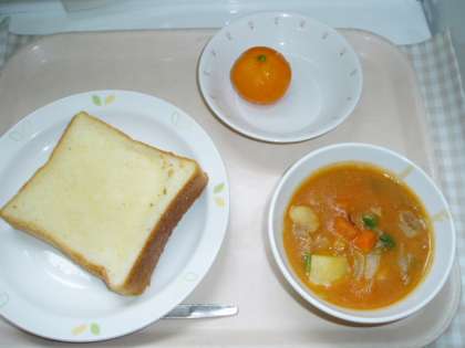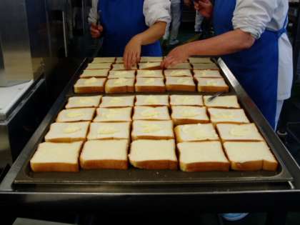 バターをクリーム状に溶かし、グラニュー糖と混ぜたものを食パンに1枚ずつぬっています。オーブンで焼き目をつけてできあがりです。代表的なハンガリー料理、パプリカパウダーが入っているハンガリアンシチューができあがりました。辛くないスパイス、パプリカをハンガリーでは多く使われています。