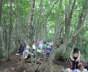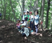 11時15分、鉱石山の頂上に到着しました。頂上は展望は開けていませんが、太陽の光に当たった美しい緑の下でお弁当を食べました。気持ちいいです。グループごと、頂上の写真を撮りました。