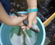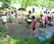 14時15分、ビレッジに無事に帰ってきました。子どもたちは頑張って歩きました。そして、15時からマスつかみ。冷たい川の水に足を入れ、つかみます。ぬるぬるしているので、なかなかつかめません。つかまえたら大喜び。すごく楽しんでいました。