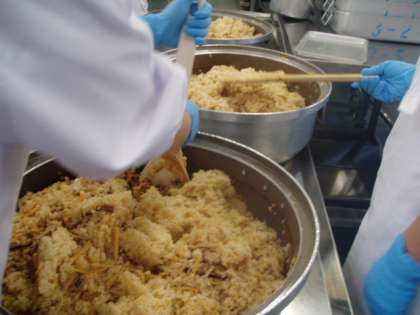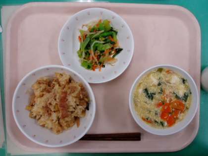 しょうゆ味で炒めた具をもち米と米で炊いたおこわに混ぜて、中華風おこわができあがります。とろみをつけたスープに溶きたまごを混ぜ、にらたまスープの完成です。にらにはβーカロテン・ビタミンCが多く含まれています。また香り成分の「アリシン」は疲労回復に必要なビタミンB1の効果を高くする働きがあります。