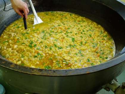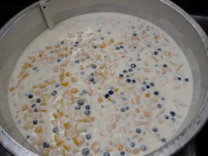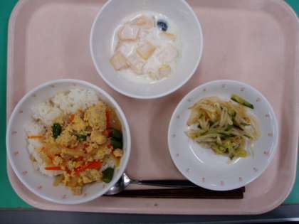 にんじん・たまねぎ・さやいんげんなど具だくさんな親子丼の具ができました。だしととり肉のうま味で、おいしく野菜が食べられます。本日は今が旬のブルーベリーが入ったフルーツヨーグルトになっています。さわやかな酸味がおいしいデザートです。