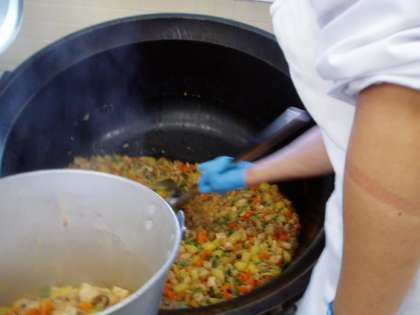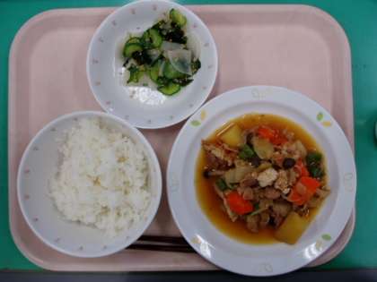 じっくりと煮こんだ五目うま煮ができあがり、各学級に配缶しています。生揚げは下味をつけて煮たものを、うま煮に加えています。本日で今学期のランチルーム給食が終了いたしました。今学期のランチルーム給食には、透明カップに入れた旬のさくらんぼを各学級に用意し季節感を取り入れました。