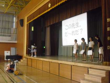 今朝は体育館で児童集会を開きました。今日は「この先生、だ〜れだ集会」でした。変装をした先生の3枚の写真をもとに、どの先生なのかを当てるクイズでした。普段とは違う先生方の姿に、戸惑いながらも楽しんで取り組んでいました。