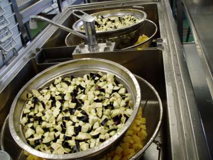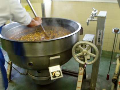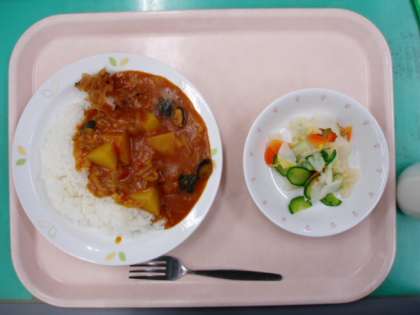 夏野菜がたっぷり入ったカレーライスです。かぼちゃ・なすなどの火の通りをよく見ながら煮こんでいます。苦手な野菜もカレーにすると、おいしく食べられることが多いので、おすすめのメニューです。