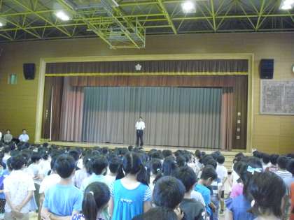 校長先生からは、通知表「あゆみ」を受け取る子どもたちに対して、自分をほめること、回りの人たちに感謝の気持ちをもつことのお話がありました。また、健康や安全に気を付けて夏休みを過ごすことなどについてもお話がありました。
