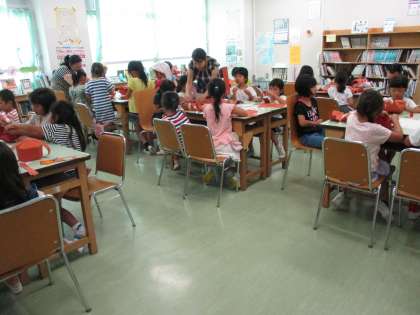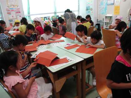 本日、24日(月)の午前中は「おはなし会」と「工作イベント」を行いました。工作イベントでは、紙のバック作りを行いました。特に低学年の児童の参加が多く、個性的なかわいいバックがたくさんできました。イベントに参加しない児童は、お互いに読み聞かせを行ったり、自分の課題に取り組んだりしていました。