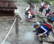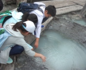 8時、湯元源泉に行って、10円玉を源泉につけてその変化を見ます。きれいになったと喜んでいます。