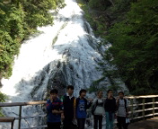 9時10分、湯滝の前でグループ写真を撮りました。空の青、木の緑、滝の白がとてもきれいです。
