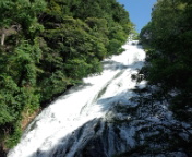 湯滝をバックに