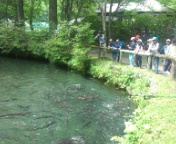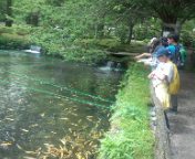 13時10分、魚と森の観察園に着きました。ここはマスの養魚場です。ひとり1カップのマスのえさをもらって、様々な池で泳いでいるマスにえさをあげて楽しみました。マスと触れ合いながら、マスのことに興味をもったでしょうか。