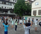 8月4日、日光林間学園3日目の朝を迎えました。天気は昨日よりいいです。子どもたちも元気に起床しました。朝会の場所はツバメがたくさん飛んでいます。