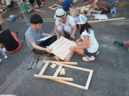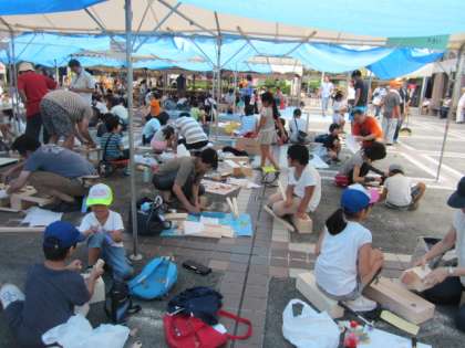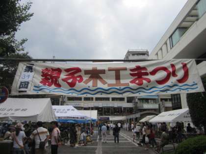 烏山区民センター前広場で、第34回親子木工まつりが開催されました。烏山小、烏山北小、芦花小、武蔵丘小、給田小の親子が参加し、木の作品を作りました。親子のよい触れ合いの場になっていました。各学校のPTAの方々もお手伝いをしてくれました。