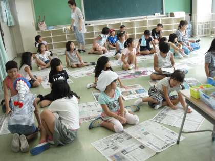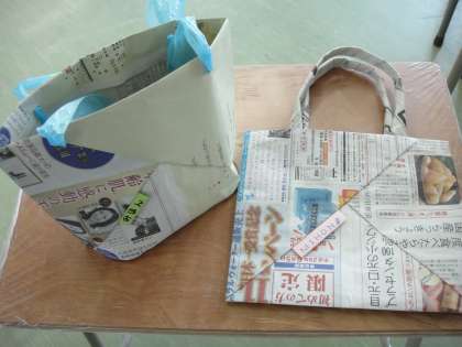 本日もたくさんの人が図書館に来て、本を読んだり、夏休みの宿題をしたりしていました。午前中は、夏休み最後のイベントを行いました。「新聞紙でエコバックを作ろう」という工作イベントで、新聞紙を折ってバックを作りました。気に入った新聞紙の絵や写真がバックの表にくるように、工夫して作っていました。参加してくださった保護者の方や、ボランティアの方々にも、作るお手伝いをしていただきました。