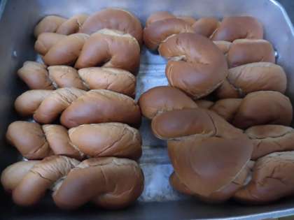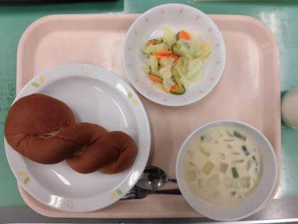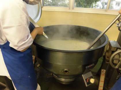 本日のココアパンは工場でねじり形成し、今朝焼いたパンが届きました。ペースト状の白いんげん豆を混ぜているので豆が入っていることに気づかない子供も多い、ポタージュをつくっています。手作りのホワイトルーをゆっくり入れてとろみをつけます。