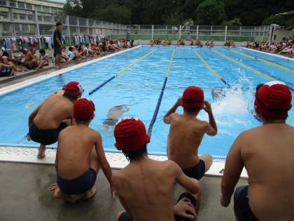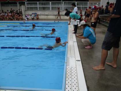世田谷区立小学校の連合体育行事として開催されているもので、25・50・100mの自由形・平泳ぎの個人種目、6年生は自由形50m×4人・25m×8人のリレーにもエントリーして取り組みました。