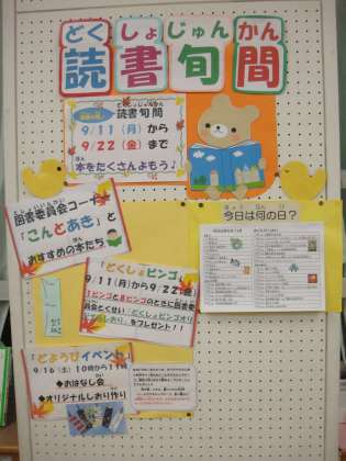 来週から、読書旬間が始まります。今年度は、9/12,9/19(火)の両日、先生方がいろいろな教室に出かけて行って本の読み聞かせを行います。担任ではない先生がいらしてくださるので、お楽しみに。