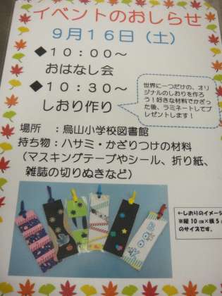 また、14日(木)には、図書委員会の人たちによる絵本の読み聞かせ集会が開かれます。「読書ビンゴ」では、ビンゴになったら図書委員より「しおり」がプレゼントされます。16日土曜日の図書館開館では、イベントとして「しおり」作りをします。たくさんの人の参加を待っています。