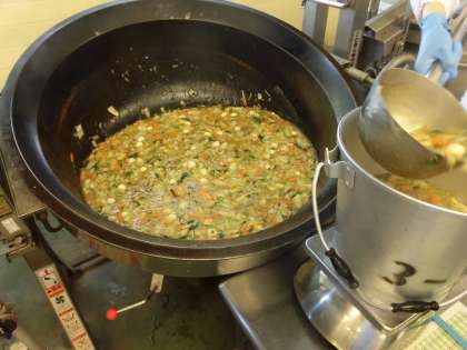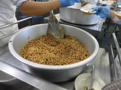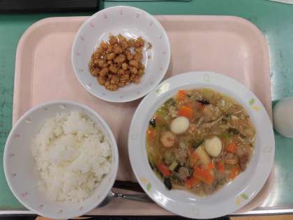 パリっと揚げた大豆とじゃこに甘辛いタレをあえた大豆とじゃこの甘辛は、苦手な人が多い豆をおいしく食べられる人気献立です。それぞれの食材のうま味をかたくり粉でとじた、具だくさんの八宝菜もできあがりました
