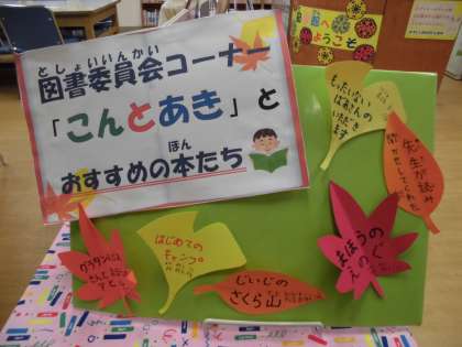 本日、読書旬間中のイベント行事の一つとして、図書委員会による集会が行われました。図書委員会の中で話し合って決めた「こんとあき」の本の読み聞かせとおすすめの本の紹介をしました。集会が終わると「続きが知りたい。」「読んでみたい。」という声が多数聞かれていました。図書館に、集会で発表された本が並べられると、すぐに貸し出し中になっていました。