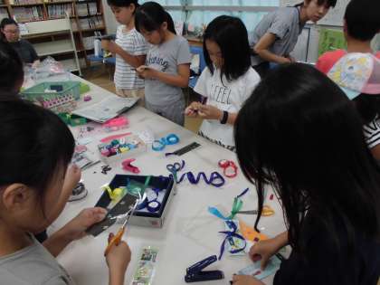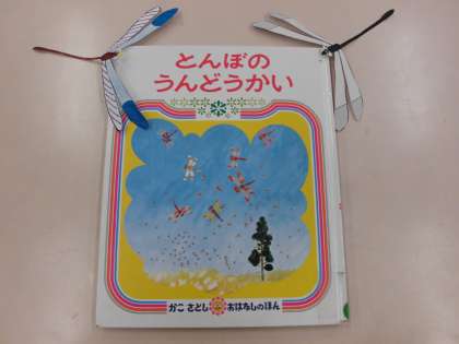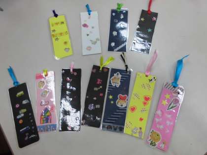 本日の授業のない土曜日、図書館開館を行いました。10時からのおはなし会では、「とんぼのうんどかい」の読み聞かせを行いました。トンボが出てくるので、トンボの飾りを作りました。その後、「オリジナルしおりつくり」をしました。自分の好きなシールや飾りを付けをしたあと、ラミネートフィルムをかけ、リボンを付けて完成させました。それぞれお気に入りのしおりが出来上がり、「本を読むとき使おう。」と話しながら、うれしそうに持ち帰っていました。