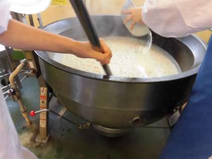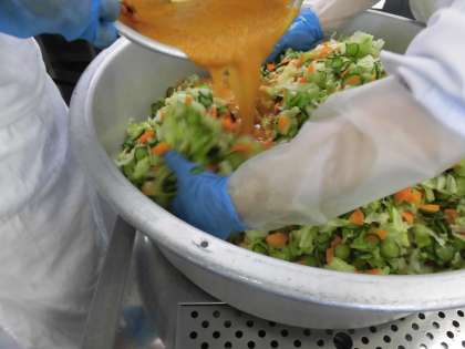 本日のサラダはイタリアンサラダ、パプリカパウダーを混ぜて、オレンジ色になったドレッシングを野菜にあえます。コーンシチューのコクを増すために、シチューの仕上げに粉チーズを入れてシチューの完成です。