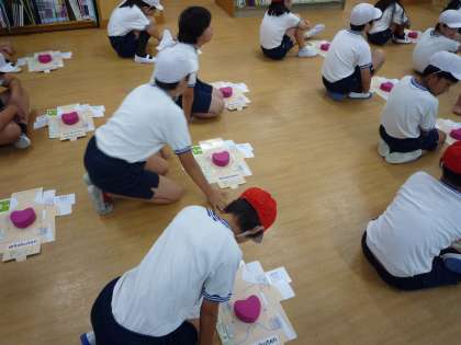 “ウィルチェアーラグビー体験”では、選手の話を聞いたり、実際に車いすを操作したりしました。車いすを操作する難しさや車いす同士が接触する衝撃などを体験しました。“いのちの教室”では、近代五種目の経験と現在ライフセーバーをしている講師から、心肺蘇生法を教えていただきました。日本では年間約6万人の方が心臓突然死によってなくなっていることや、心臓マッサージを行うことやAEDを正しく使用することにより助かる命があることを学びました。