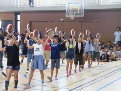 校長先生の話と親善訪問団団長の話に続き、4年生が「エイサー」を披露しました。