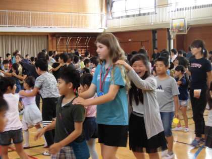 その後、親善訪問団の子ども達も一緒に全員で「じゃんけん列車」で交流を深めました。