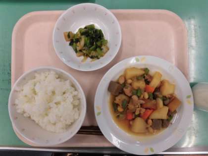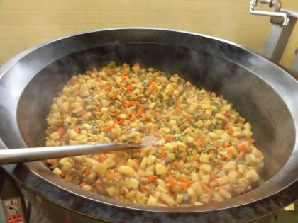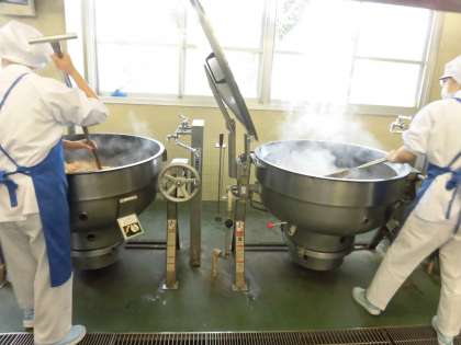 筑前煮を回転2台使用して調理しています。煮崩れないようにじっくり煮こんでいるので、味がしみ込みにくいこんにゃくもおいしく煮えています。最後に2台の釜の筑前煮の味が同じになっているかを確認をして、できあがりです。