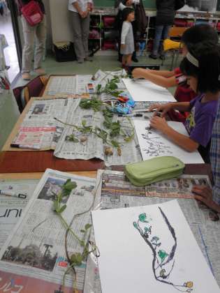 2年生は、育てた落花生を観察しています。みんな上手に描けています。