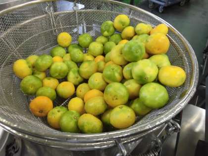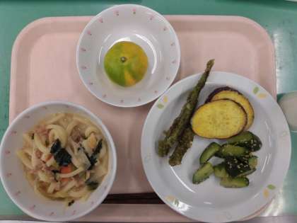 具だくさんの、みそ煮こみうどんができました。野菜やぶた肉をしっかり煮こんだ温かいうどんを食べて、体の芯から温まりました。愛媛県のみかんが届き、洗った後に各学級に配缶しています。