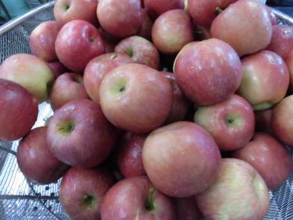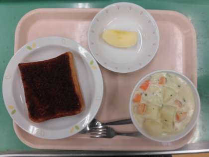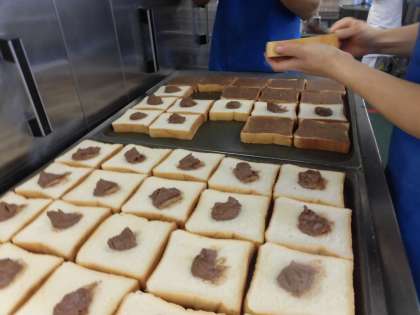 本日のくだものはりんごです。100個のりんごを洗い、皮むき器で皮をむいていきます。給食室でつくったココアペーストを食パンに丁ねいにぬり、オーブンで表面を焼きココアトーストのできあがりです。